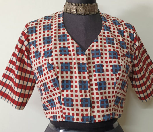 Buy Maroon Dabu Blouse with Checkered Patchwork Sleeves | Godhuli