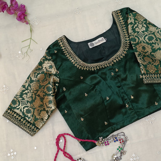 Buy Bottle Green Silk Brocade Sleeves Aari Work Blouse | Godhuli