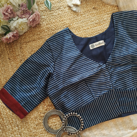 Buy Navy Blue Gaji Silk Stripes Blouse | Godhuli