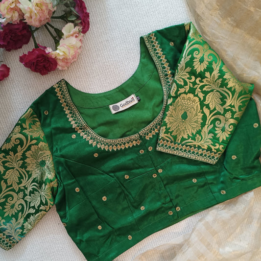 Buy Leaf Green Silk Brocade Sleeves Aari Work Blouse | Godhuli