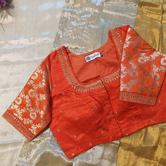 Buy Orange Gaji Silk Brocade Sleeves Aari Work Blouse | Godhuli