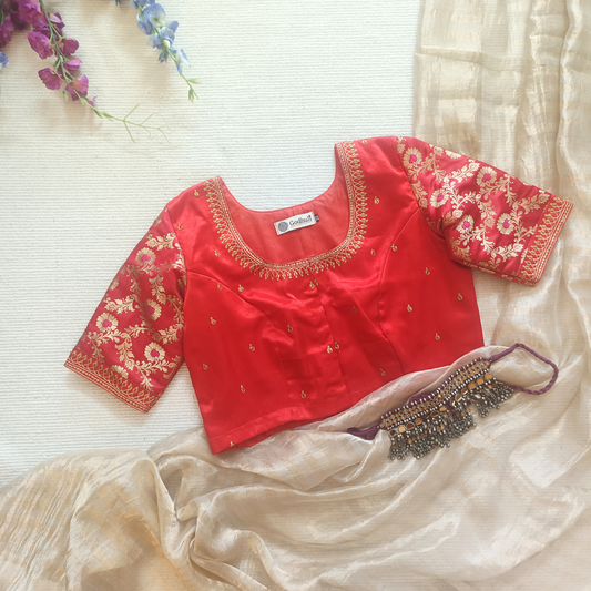Buy Red Gaji Silk Brocade Sleeves Aari Work Blouse | Godhuli