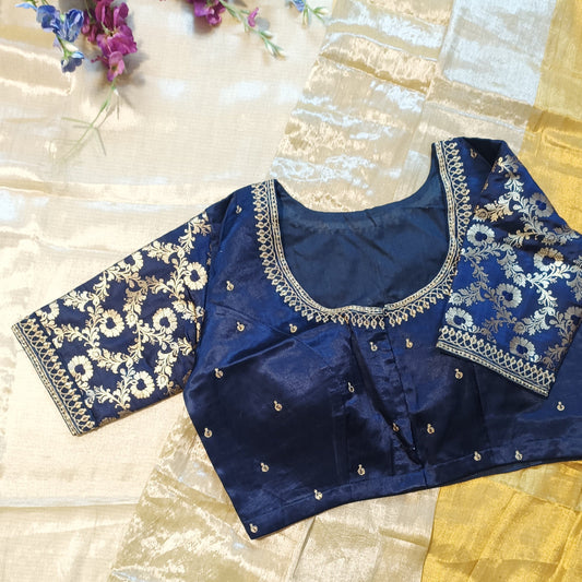 Buy Navy Blue Gaji Silk Brocade Sleeves Aari Work Blouse | Godhuli