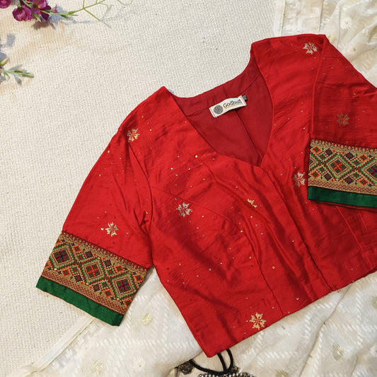 Readymade Red Cotton Silk Zari Brocade Border Blouse | Godhuli