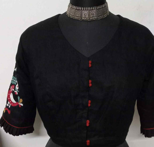 Buy Black Embroidered Flex linen Cotton Blouse | Godhuli