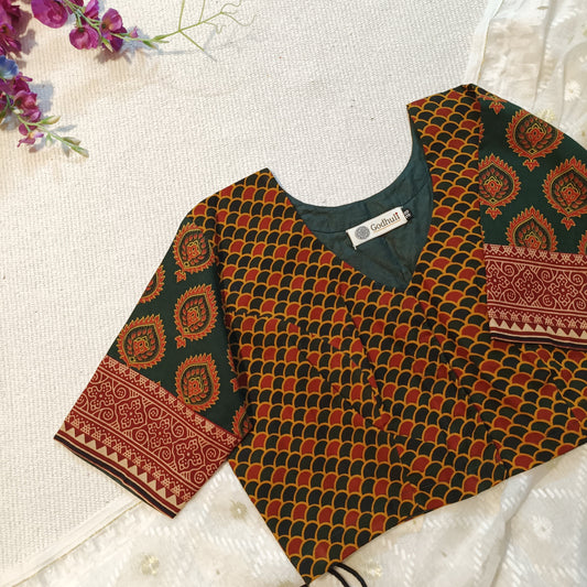 Buy Dark Green Red Ajrakh Cotton Blouse | Godhuli