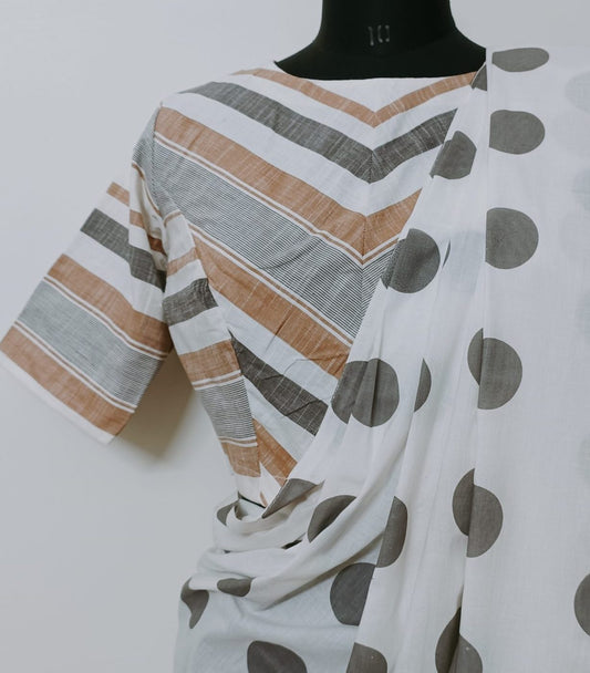 Buy Big Polka Dot Off-White Saree-Stripes Blouse Combo | Godhuli