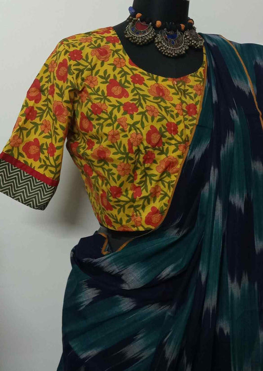 Buy Navy Blue Sea Green Ikat Saree Floral Blouse Combo | Godhuli
