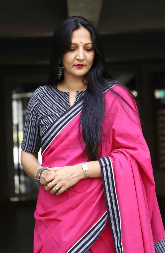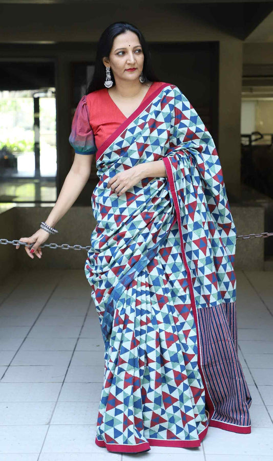 Buy Geometric Print Ajrakh Saree with Striped Pallu | Godhuli