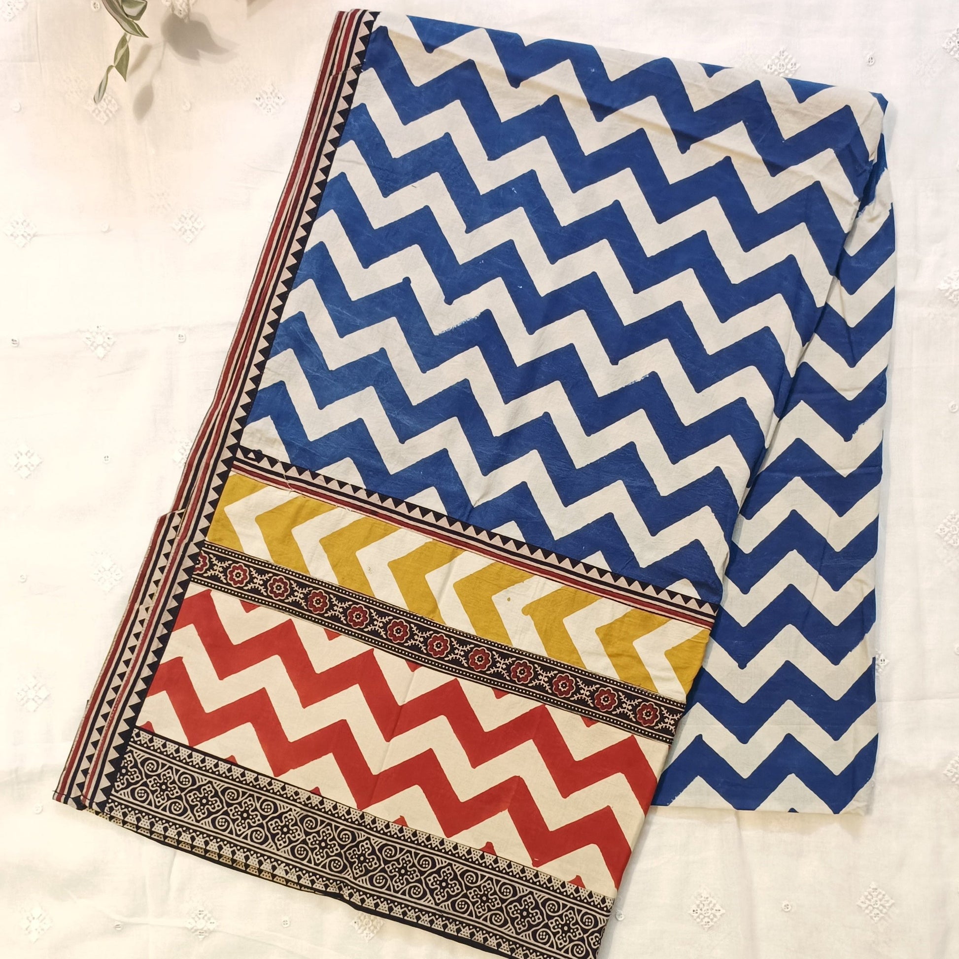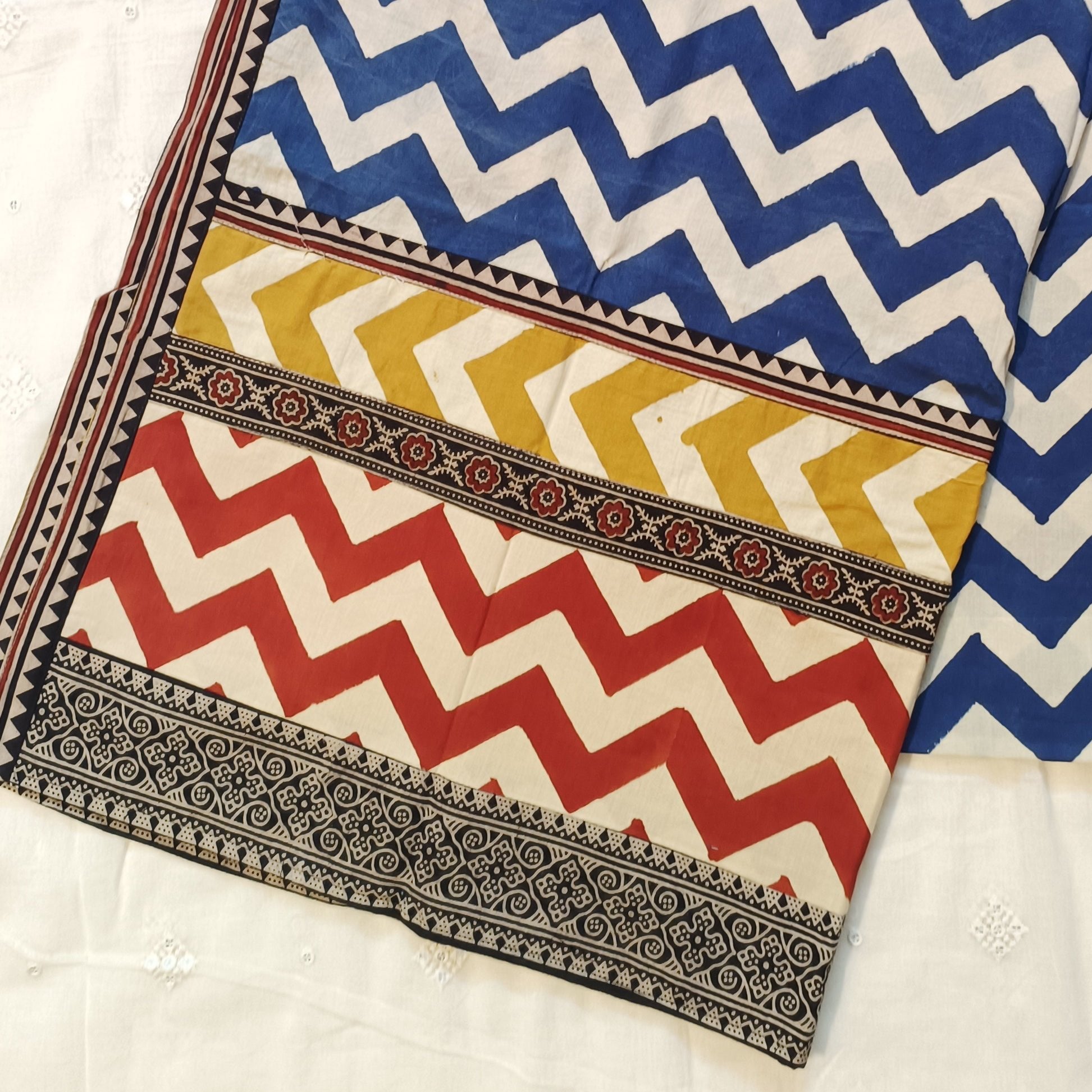 Beautiful fusion of prints and patchworked in a pattern, to make this lovely handcrafted piece of dupatta. Different colours and prints in a sync, making it a unique piece of craft. Dabu cotton dupatta in blue chevron print with contrast colour patch worked prints in palla .
