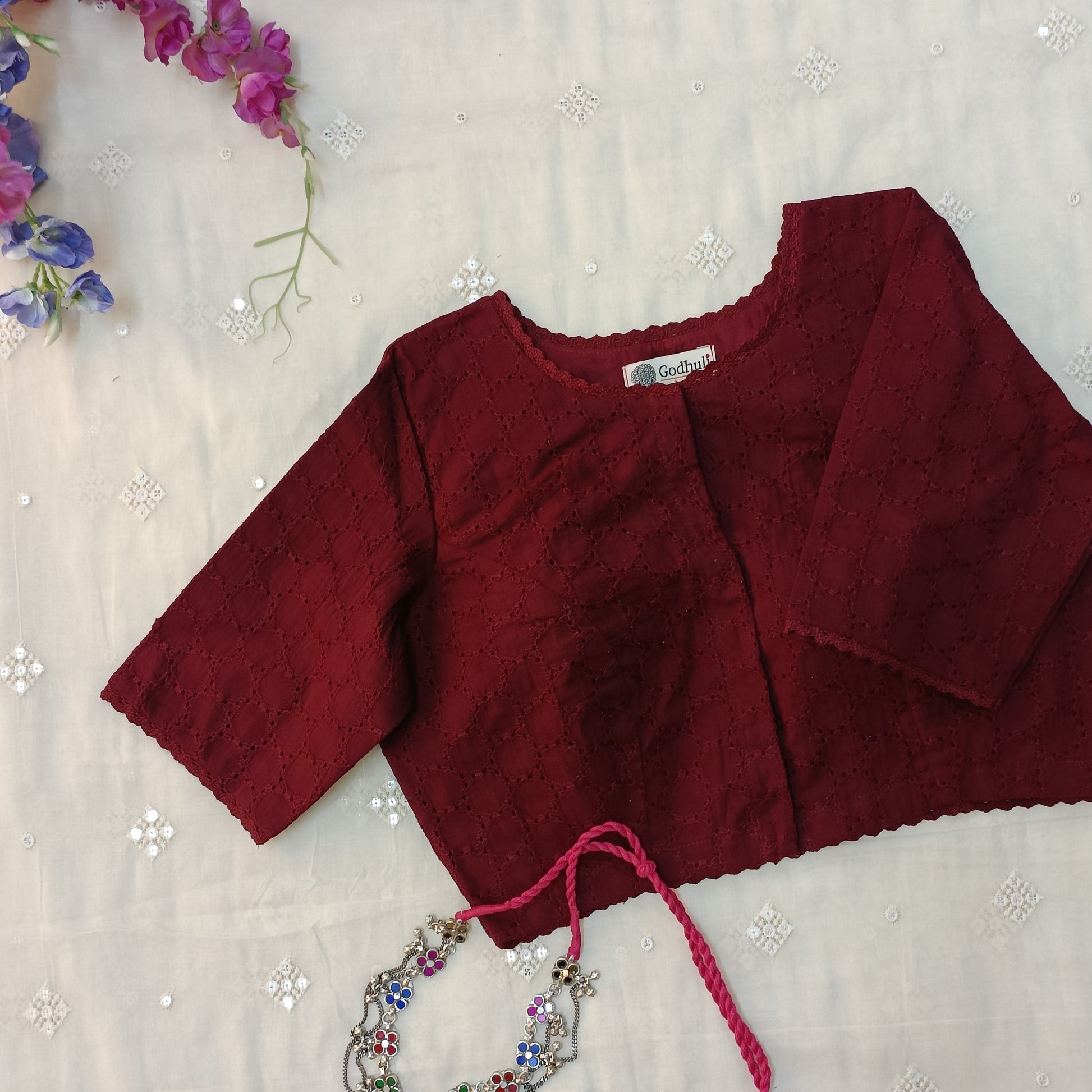 This Maroon Cut Work Blouse with Sleeves is an essential piece for those who appreciate the perfect combination of traditional craftsmanship and contemporary elegance in their wardrobe.
