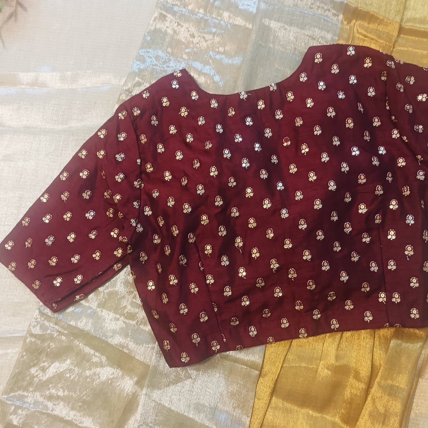 Introducing the Maroon Zari Work Silk Blouse—an elegant combination of silk and intricate Aari embroidery and Tikki work, adding a touch of grandeur to the design.