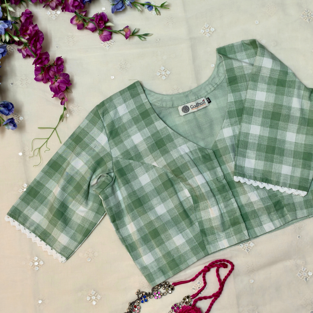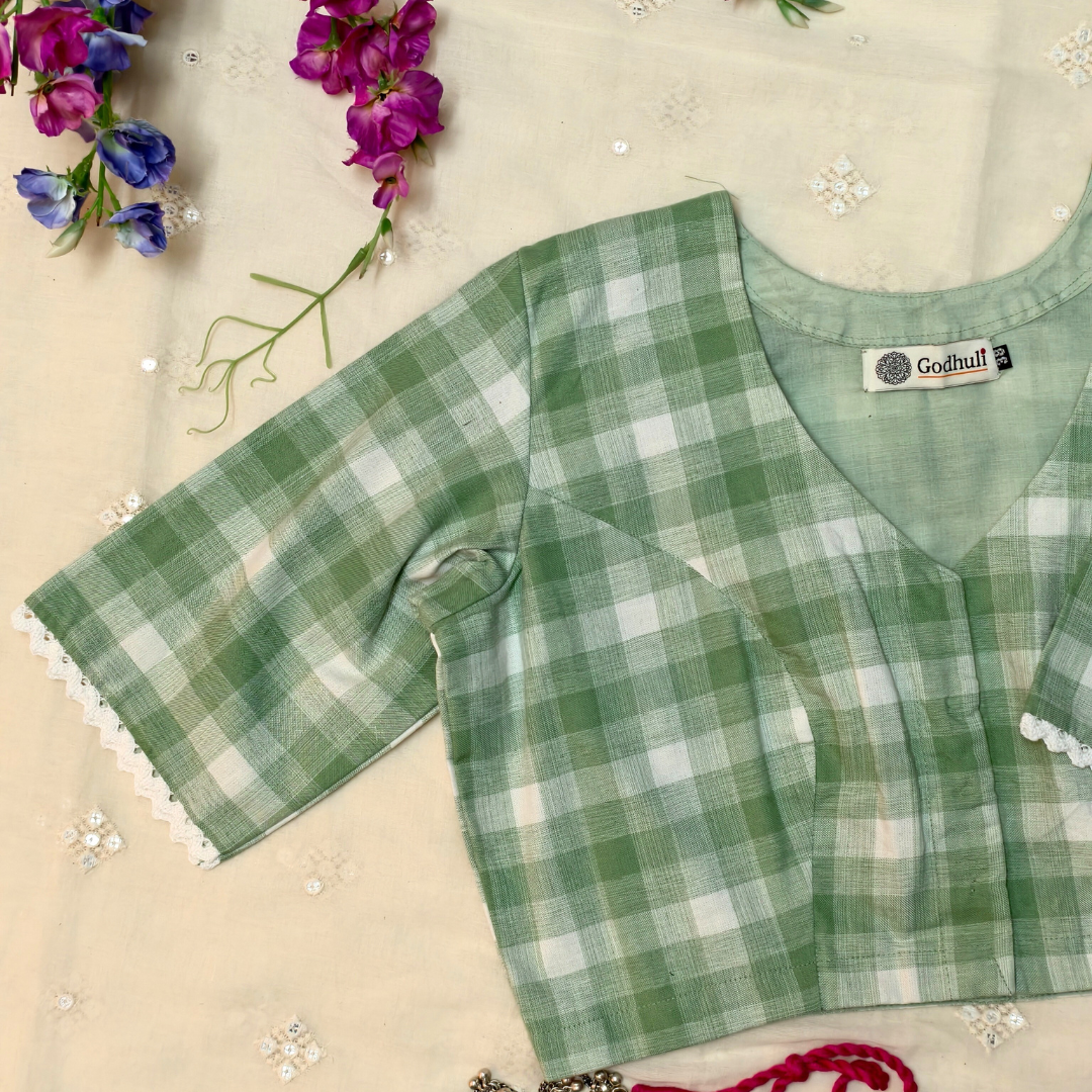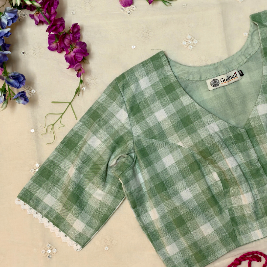 Ready to wear blouse – Clean checks in olive green and white on breathable cotton blend fabric. A smart and easy-to-style piece for your everyday ethnic wardrobe.