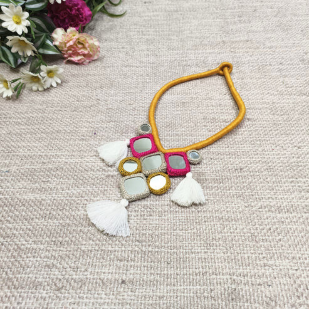 The Handcrafted Mirrorwork Yellow Dori Neckpiece is a must-have accessory for anyone looking to infuse their wardrobe with a vibrant, traditional touch, making it an ideal statement piece for any occasion.