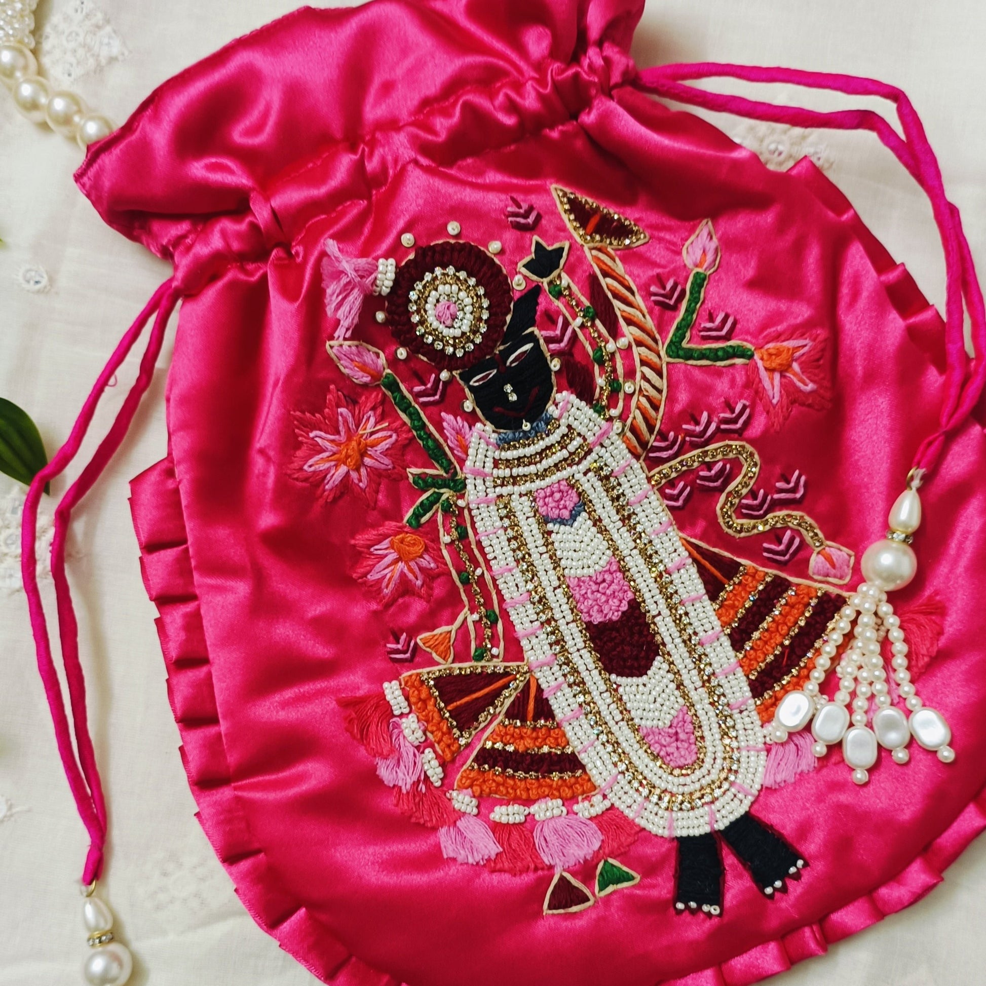 Handcrafted embroidered potli bag in gaji silk with beautiful hand-embroidered Lord Shreenathji, embellished with beads and glittering stones, pearl braided handle and tassels in the string.